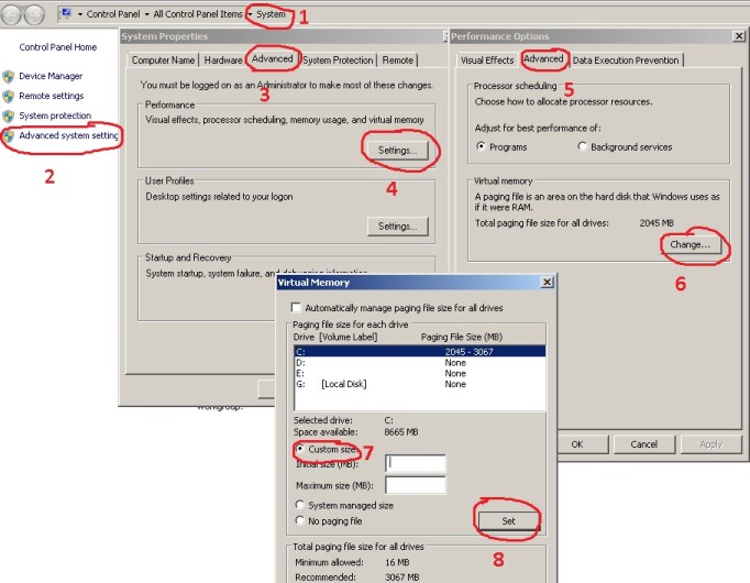 If your window runs out of physical memory then it uses virtual memory. By increasing virtual memory you can ensure that games have access to all of the memory that it needs. To make this change right click on my computer > properties > advance system setting > advance tab > performance setting > advanced tab > click on change in the virtual memory section. Then put custom size.
